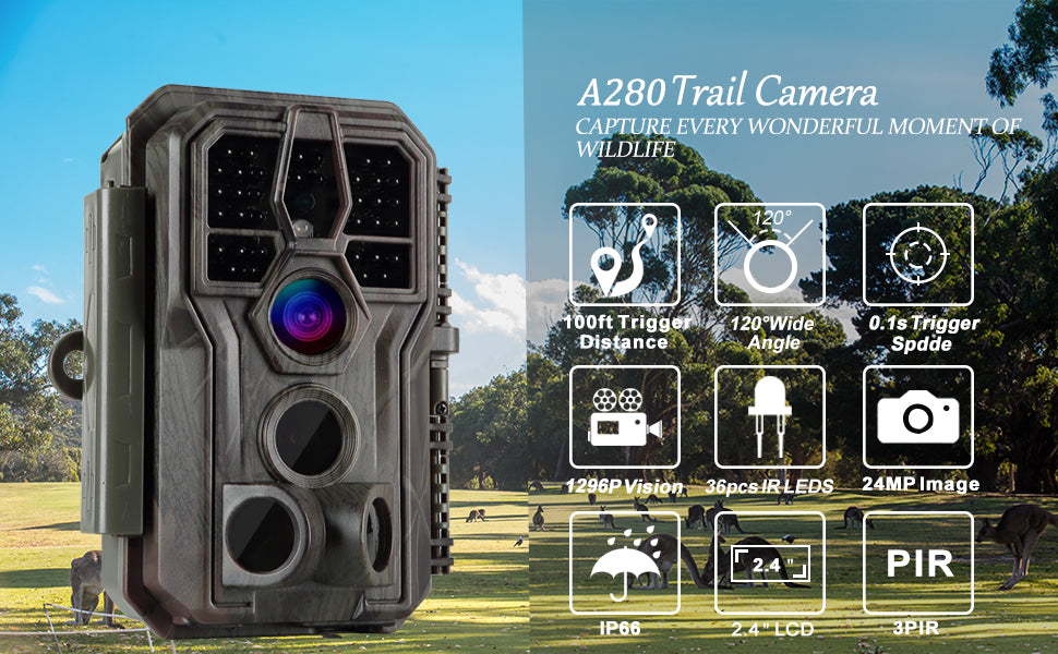 Compared with any other 16 megapixel device, Agitato A280 trail camera featuring 24MP(optional pixels: 24MP,20MP, 16MP, 12MP, 8MP, 5MP, 3MP, 1MP) resolution, allows you to enjoy the wonderful animal world through super crystal pictures.